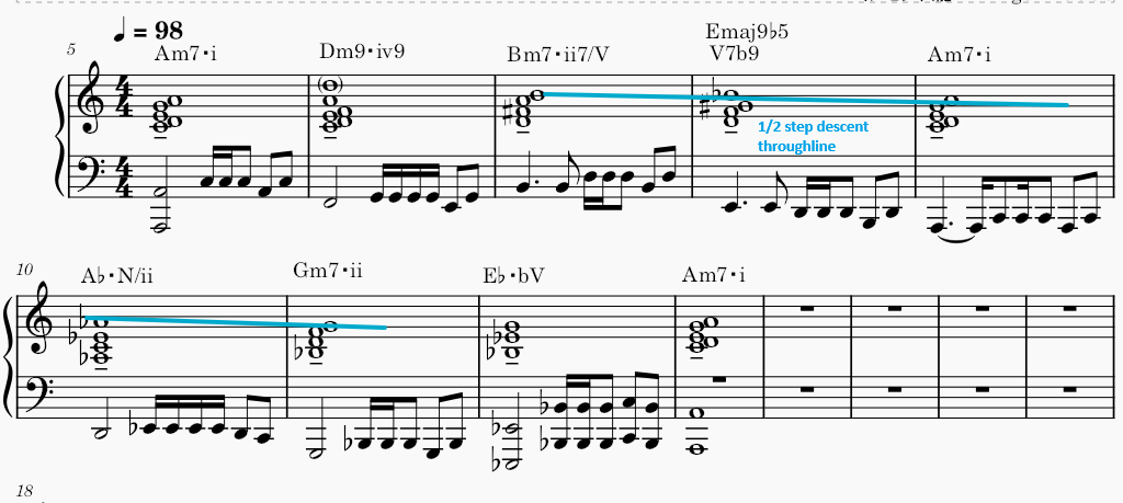 Measures 6-7 and 12-13 both have a similar kind of movement in the chords, but the sharpness is softened by the subtle shifts in the midtones that cleverly don’t change too much, along with the walking bassline.