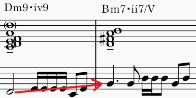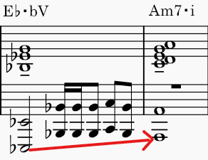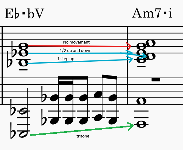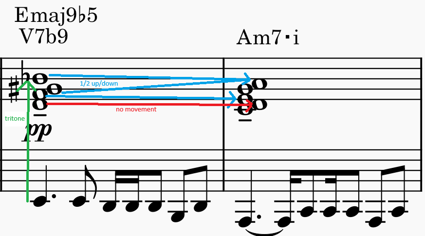 Instead of the usual V-i, V7-i, or even a V9-i to resolve the main phrase’s midpoint, we have an unusual V7b9, represented as an Emaj9♭5 chord - another tritone (this time within the chord itself)!