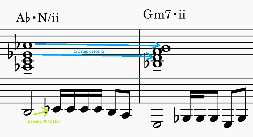 Measures 10-11 have a lot of fun as well. Measure 10 seems to feature (I say seem as it’s quite a speculative guess on my part) a Neapolitan chord acting as a pre-pre-dominant N/ii chord leading us to Gm7, with the bassline starting as a passing D0.