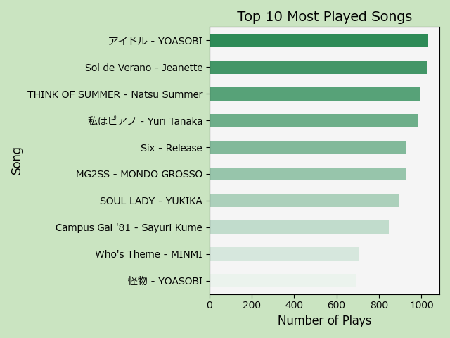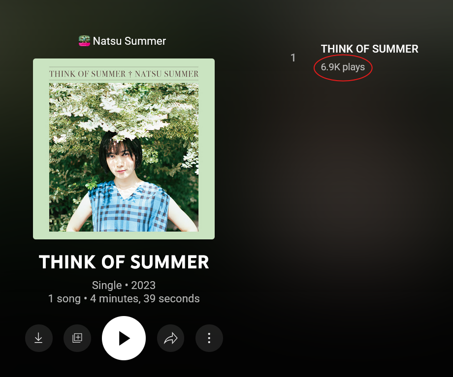 At a total of 6.9k plays between all listeners, I alone constitute about 13% of Think of Summer's listenership via YouTube Music, with around 1000 plays. That’s about 78 hours listening to just this song, averaging 25 minutes per day over the past 9 months, at a 4:39 runtime 🙃. It’s not an even distribution; there are many days I don’t listen to it at all and many where it’s all I listen to while working on something (not that I only listen to music while working - I do spend time listening to music while doing nothing else, putting my full focus onto the song).